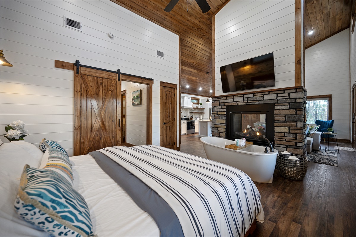 ☀ Cozy bedroom area w/ king-size bed + fireside soaking tub