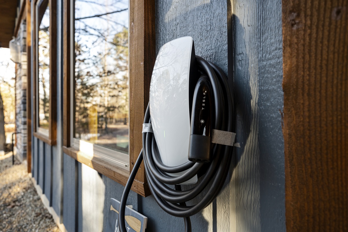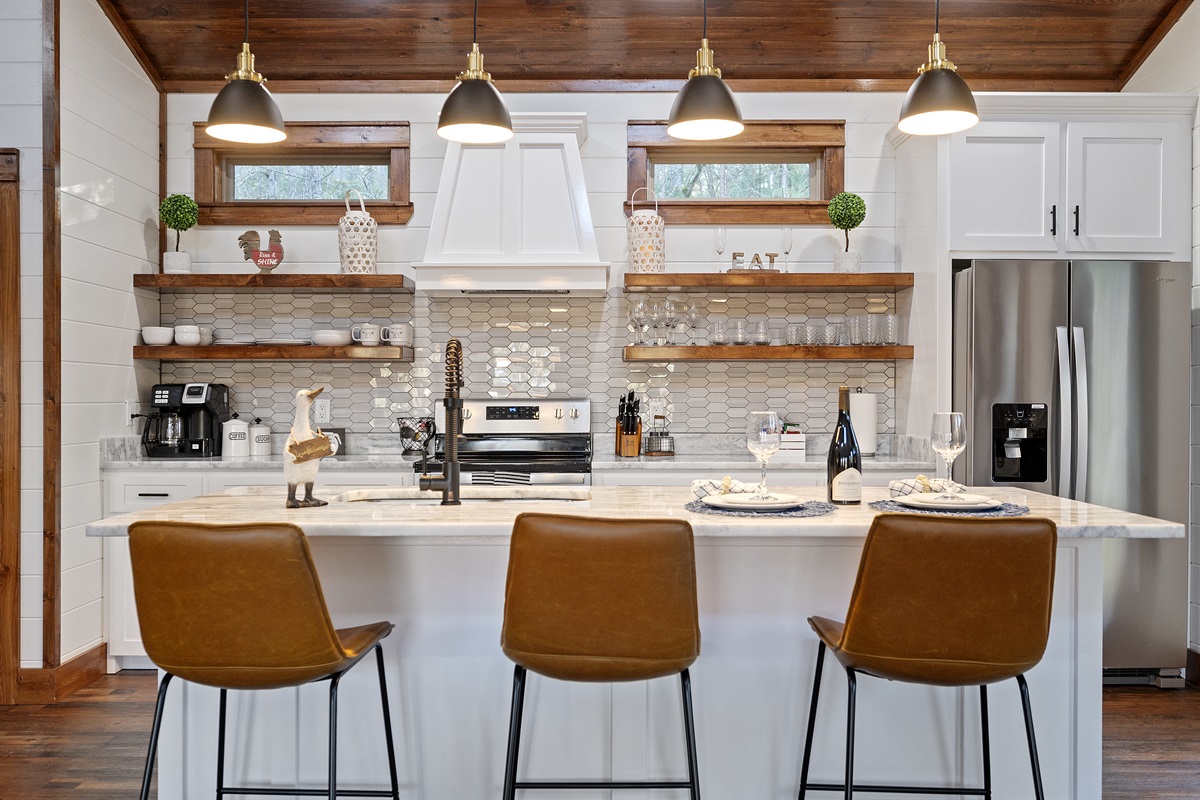 The cabin's open-concept design makes it easy to hang out together no matter which room you're in. The modern kitchen is outfitted with an oven, microwave, refrigerator, dishwasher, toaster, and enough stove and countertop space for preparing a romantic dinner with your significant other. Enjoy meals together at the kitchen counter, or take a seat at the small window front table.